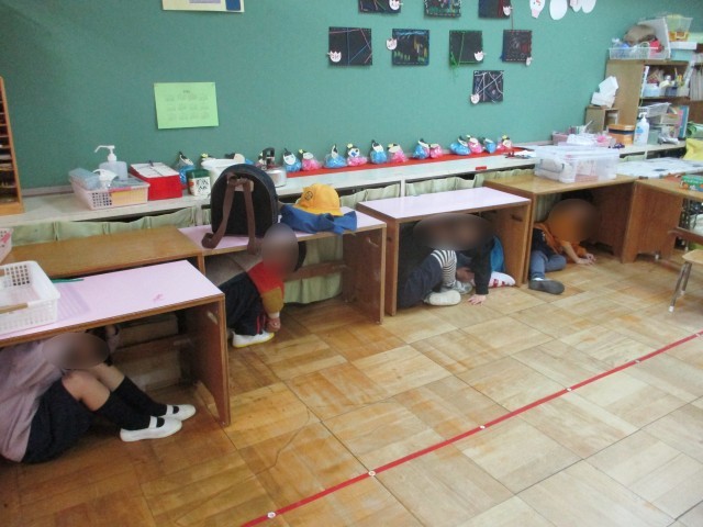 園長先生の話の中で、「机や椅子など頭を守る所が近くになかったらどうするか…」