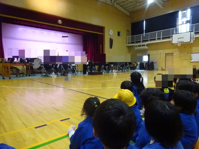 今日は今津中学校吹奏楽部の皆さんにお招きいただき、演奏を聞かせていただきました。去年のことを覚えていた5歳児は「どんな曲かな~楽しみ」とワクワクする様子が見られましたよ。演奏会が始まると、音楽に合わせて思わず踊りたくなるような曲目ばかりで、子どもたちも大喜びでした。今年度交流を深めてきた近隣保育所3園の子どもたちも一緒に楽しむことができました。最後は吹奏楽部のお兄さん、お姉さんがトンネルをつくってくれ「ありがとう」「またね」と声をかけてくれていました。近隣の中学校や保育所と関わる中で、いろいろな人との関わりや多様な体験につながり、地域の温かさを感じる演奏会となりました。