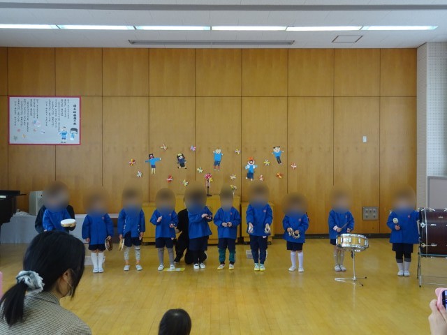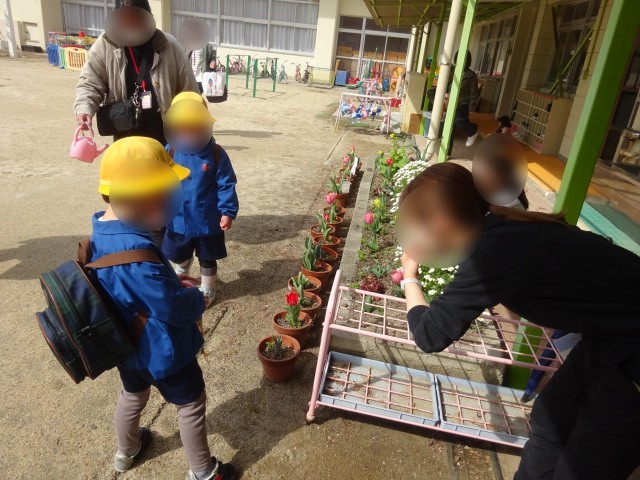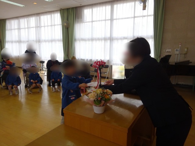 3学期終業式をしました。園長先生から進級記念品をいただき、一つ大きい組になることに期待をもつ姿が見られました。おうちの方に合奏も聞いてもらいました。拍手をもらって喜んでいましたよ。入園式でも披露する予定です。園庭ではチューリップが咲き「咲いたね」と大喜びです。4月からは幼稚園で一番大きい組ですね。元気に幼稚園に来てくれることを待っていますね。