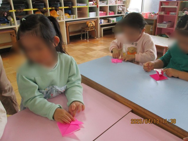 折り紙しました。 公開日 2026/04/13 更新日 2026/04/13 幼稚園日記 5歳児は折り紙でチューリップを折りました。いろいろな色のチューリップがたくさんできました。5歳児の保育室に飾られる予定です。 いいね(1)
