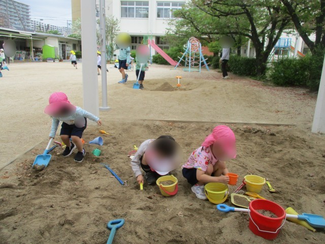 4歳児は砂場でごちそうづくりをしていましたよ。どんなごちそうができたのかな?