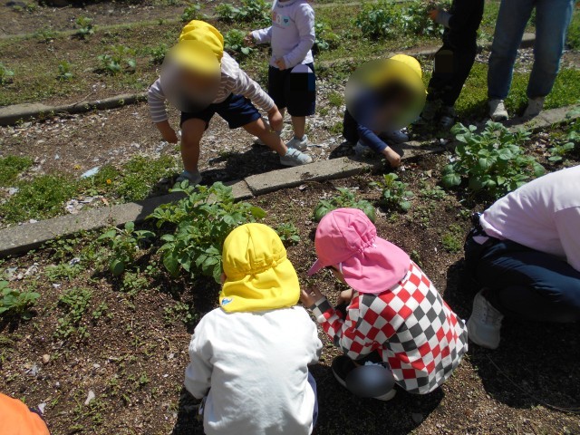 えのもとの森に着くと、昨年度の4歳児・5歳児が植えたジャガイモが大きくなっていました。