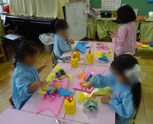 こいのぼりづくりでは、「きく組になったからできるよ」と、丁寧につくる姿が見られました。