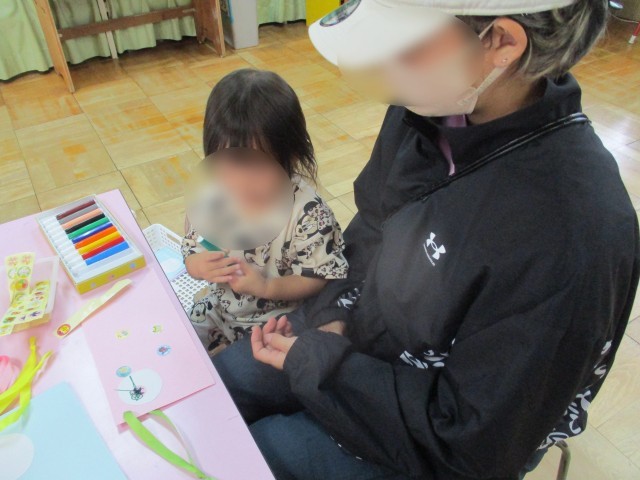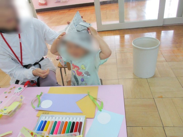 なかよしタイムでこいのぼり製作をしました。シールとペンを使って模様を付けて
