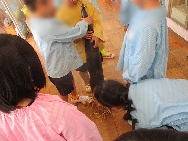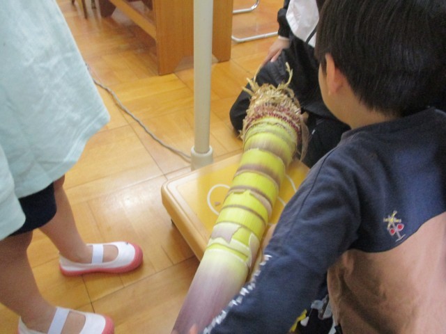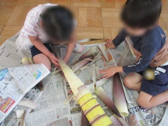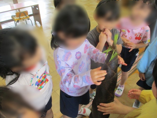 大きなタケノコを先生が持ってきてくれました。抱きかかえても持てないくらい大きく、桃組にもっていくと同じくらいの背の高さで、大喜び。皮をむいてみたり、子どもたちが体重や身長を測るように、タケノコを測ってみたいとなり、保健室へ行って計りました。「98センチ、4.75キログラム」と養護教諭の先生と一緒に発育測定をしてあげました。保育室に帰り、皮をむいていましたが、「なんだか皮をむいてもむいても、皮ばっかりやねん」「皮ばっかりや、だから病気になってるんや」「だからタケノコを寝かしてあげないといけない」と、タケノコをもう一度袋に入れて寝かせてあげました。