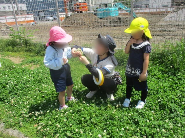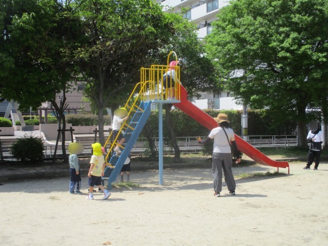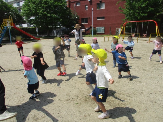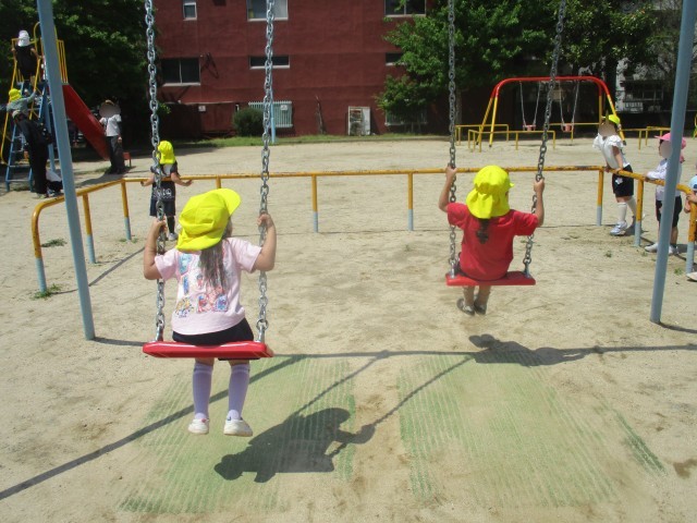 幼稚園の近くの榎本公園まで、きく組ともも組で手をつないで園外散歩に行きました。道路を歩く方法をきく組は、歩きながら教えてくれていました。公園について、「どうぶつたいそう1・2・3」をしました。大好きなゴリラもみんなで笑いながらしました。ブランコや滑り台をしたり、リレーをしたりして、公園での活動を楽しみました。疲れて、幼稚園に帰ることもきく組に引っ張ってもらい、帰ってきましたが、「楽しかった」と話して、おなかがすいたので、しっかりとお弁当を食べました。