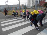 4歳児、5歳児で手をつないで榎本福祉会館へ行ってきました。行きも帰りも交通ルール...