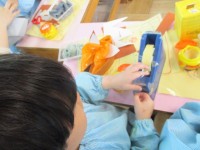 金曜日はいよいよ発表会本番。5歳児はもっと本物らしくしたいと、劇遊びのお面や小道...