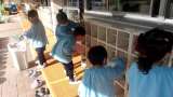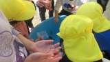 5歳児クラス側の足洗い場に置いてあるタライに氷が張っていました。 「冷たい!」「...