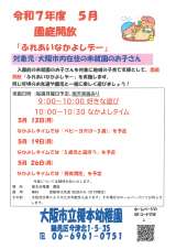 5月の園庭開放「ふれあいなかよしデー」のお知らせです。 事前予約は必要ありませ...