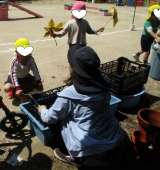 園庭では先生と子どもたちが 咲き終わったチューリップの球根抜きや 収穫が終わった...