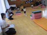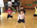 4歳児は遊戯室で存分に体を動かして遊んでいます。ピアノの音やリズムに体の動きを合...