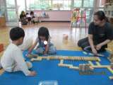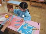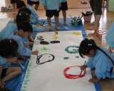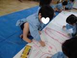 担任の先生が、白くて長い紙と 色々な色の絵の具を保育室に準備すると、 「いっぱい...