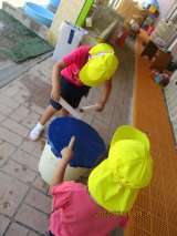 園庭で水鉄砲をして遊びました。先生がする大雨シャワーもいい気持ちでした。