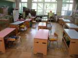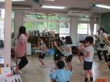 5歳児の保育室前から「トントコ、トントン」と樽太鼓の音が聞こえてきます。夏祭りは...