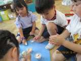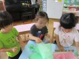4歳児はお魚づくりをしました。 お花紙をふんわりと袋に入れる子、ぎゅっと握って入...