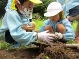 春にえのもとの森の畑に植えた、じゃがいもを掘りに行きました。 「じゃがいものお顔...