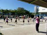 全園児で「ワイワイうんどうかい」の体操をしています。リズミカルな曲に子どもたちの...