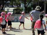 園庭で2クラス一緒に体操しました。音楽に合わせて一緒に歩いたり、のびのびと体を動...