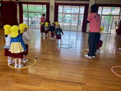 3歳児ひよこ組は、フラフープを使って遊んでいました。先生が言う色を聞き、その色のフラフープを探して入っていました。お友達と同じ輪っかの中に入った子どもが、「〇〇ちゃん、ぎゅ〜!」と思わずハグをしていました!幼稚園での生活や同じクラスの友達へ安心や親しみを感じていることが、自然と表れていました。