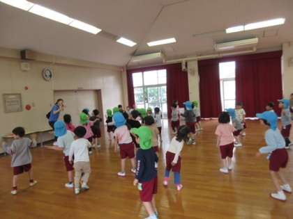 午前中は園庭で遊ぶことができなかったので、ホールにレッツゴー!