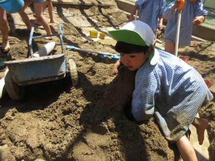 青空が広がる快晴の中、5歳児の2クラスで泥んこ遊びをしました。