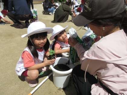 夏野菜の苗を植えたよ 公開日 2024/05/17 更新日 2024/05/17 子どもの姿 子どもたちがおうちの方と一緒に苗を植える、親子栽培を行いました。 ミニトマト・ナス・ピーマン・オクラの4種類から好きな野菜を選び、 親子でふれあいながら、野菜の苗植えを楽しんでいました。 「おおきくな〜れ!」「大きいのができますように!」 子どもたちは、おうちの方とそれぞれ願いを込めて丁寧に植えていました。 いいね(0)