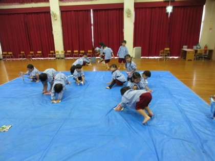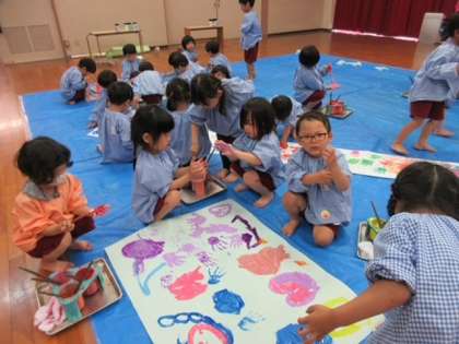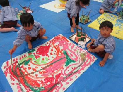 筆の持ち方、絵の具ポットに筆を戻すときは同じ色のところへなど、気を付けながら、みんなで絵の具遊びをしました。