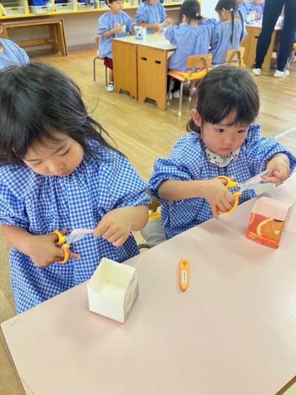 3歳児ひよこ組が初めて、はさみを使って遊びました。