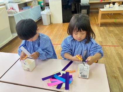 どの子も、もくもくと集中してチョキチョキ切って遊んでいました。「おかわりの紙がまだあるよ」と伝えると「おかわりください!」とたくさんの子どもたちが言いに来て、用意していた紙がすべてなくなりました。ひよこ組の子どもたちはまだまだたくさん切りたかった様子!またしようね。