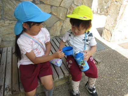朝から天気が良く、気温がぐんぐんと上がっていたので、影を探してはみんなでこまめに水分補給もしました。3歳児の子どもが、うまくコップにお茶を入れられず困っている姿を見た、ペアの5歳児のお姉さんが優しく手伝ってあげている姿も見られました。