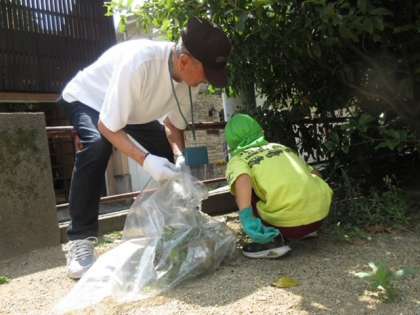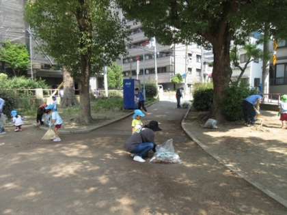 幼稚園の近くにある、子どもたちがおうちの人ともよく遊びに行く常盤公園を地域の方々と一緒にお掃除しました。地域の方々と2人1組または3人1組となり、公園に落ちているお菓子のゴミや落ち葉を拾ったり、雑草を抜いたりしました。「こっちに落ち葉があるよ」「いっぱい拾ってくれてるね」と地域の方々が子どもたちに優しく声をかけてくださり、子どもたちも掃除を楽しみながら参加していました。お掃除するとなんだか心もスッキリ!気持ちがいいね。地域の方ともゆっくりと関わることができ、より親しみ感じていたように思います。