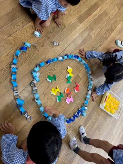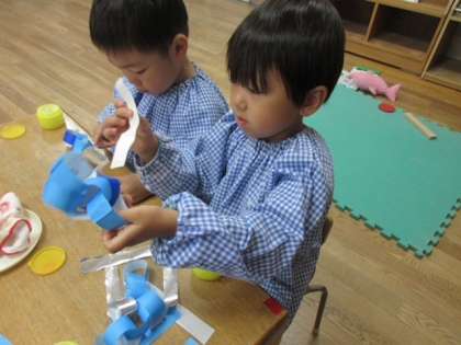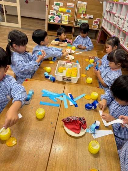 朝から雨と風がザーザー、ビュービュー…そんな雨の様子を5歳児や4歳児の子どもたちが輪つなぎで表現して遊んでいました。「こうやって輪っかを繋げていくんだよ」と先生の代わりに4歳児に教えている5歳児の姿も!床に輪つなぎを円形に置き、「池だよ〜!」「魚釣りしたいなぁ…」と自分たちでイメージを膨らませていました。
