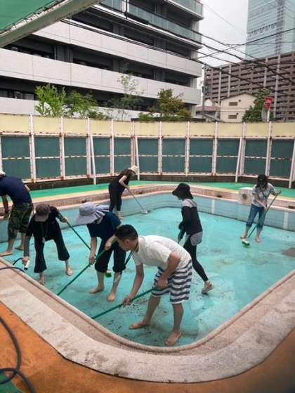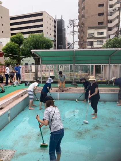 来週からついにプール遊びが始まります。それに伴い、保護者の方々がプール掃除をしてくださいました。1年間の汚れが溜まったプールはくろ〜くなっており、ゴシゴシと丁寧に磨いてくださいました。おかげでプールサイドやプール内が見違えるほどピカピカに!暑い中、朝から本当にありがとうございました!
