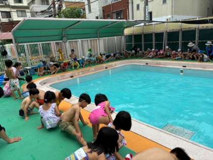 今日は各クラス少しずつしかプール遊びができませんでしたが、明日からは5歳児30分、4歳児25分、3歳児20分ずつ遊びます。いっぱい遊んで水と仲良くなろうね!