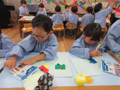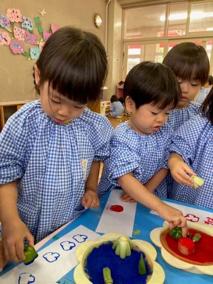 それぞれの保育室を覗いてみると、野菜でペタペタ、はさみをチョキチョキ、のりをペタペタ、ペンでカキカキ…つくってあそんでいる子どもたち。「わぁすごいキレイ!」「ここがちょっとむずかしいなあ」「できた!!」と自分で考え、つくり進める姿にとても成長を感じます。