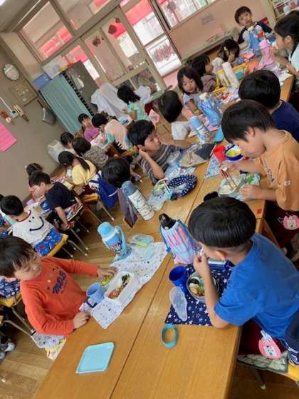 ホールで運動会ごっこをして遊んだ後は、全クラスで一緒に弁当タイム!好きな保育室を選び、異年齢で一緒に弁当を食べました。「一緒に弁当を食べよう?」「はな組の部屋に集合な!」と5歳児のお兄さんお姉さんに声をかけに行く4歳児。「お隣、いいですか?」と3歳児に声をかける5歳児。いろんな友達と一緒に食べるってなんだか楽しいね!