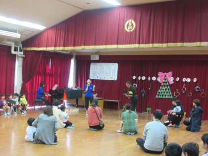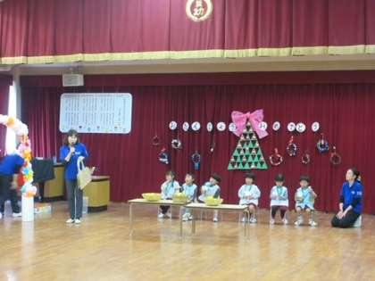 12月生まれの6人のお友達の誕生会をしました。12月らしさがいっぱい詰まった、飾りつけられたホールでおこないました。今月はなんと、もり組の子どもたちが司会進行をしてくれました。誕生児はドキドキしながらも一生懸命自己紹介をしており、周りの子どもたちもお祝いする気持ちをしっかりともって参加していました。
