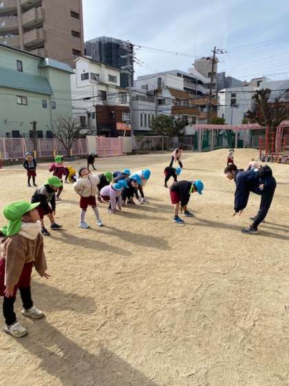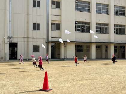 まずは幼稚園の園庭でしっかりと準備体操!そのあと、小学校に向かい、いざたこあげ!勢いよく走るとどんどん空高くあがるたこに子どもたちも大喜びでした。また活動の途中、強い風がビューンと吹いてくると「先生!走らなくてもたこがあがってる!」と驚きの表情でした。