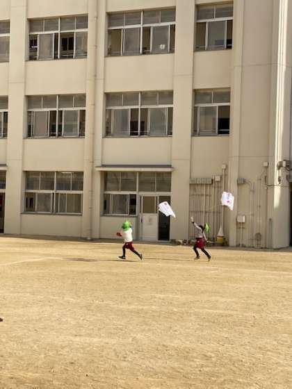常盤小学校の校庭をお借りして、たこあげをして遊びました。