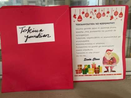 朝、園庭で遊んでいると5歳児の子どもが「あれ、なに?!」と、カリンの木の上に赤い封筒を見つけました。開けてみると、なんとサンタクロースからの手紙が!!