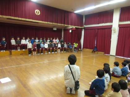 そのあとは4歳児と5歳児が各クラスでよく歌っている歌を歌い合いました。「立ち方がかっこよかったよ」「私のところまで声がとっても届いたよ」など感じたことを伝え合い、次も頑張るぞ!という意欲に繋がっていることと思います。