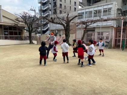 鬼はーそと! 公開日 2025/02/03 更新日 2025/02/03 子どもの姿 今年の節分は2月2日の日曜日。その日は幼稚園がお休みのため、少し早いですが1月31日に子どもたちと豆まきをしました。悪いもの(鬼)を追い払い、良いもの(福)を呼び込むという願いを込めて、各クラスで活動しました。鬼のお面をつけた先生に向かって全力で豆を投げる子どももちらほら…。今年一年、みんなが健康に、そして幸せに過ごせますように。 いいね(0)