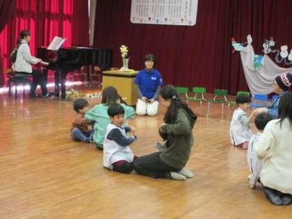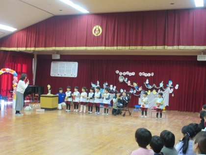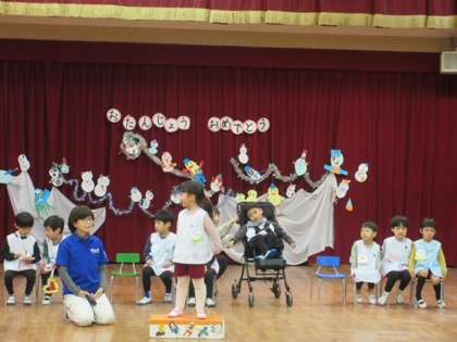 2月生まれのお友達をみんなでお祝いしました。今月は1人お休みだったので9人のお祝いをしました。はな組の子どもたちが司会をして会を進行してくれる姿は、もう年長児のようでした!ひよこ組からはかわいいハートのペンダントをもらい、園長先生とは楽器演奏を披露してくれました。9人の息がぴったりと合った素敵な合奏でした♪みんなで歌を歌ったり、ダンスをしたり…生活発表会の遊びがまだまだ続いている誕生会となりました。