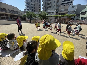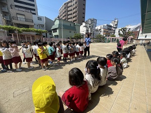 今年度、初めての避難訓練をしました。ひよこ組(3歳児)は、非常ベルの音に少し不安そうな表情も見られましたが、年長児の避難訓練の様子にみんな興味津々でした。