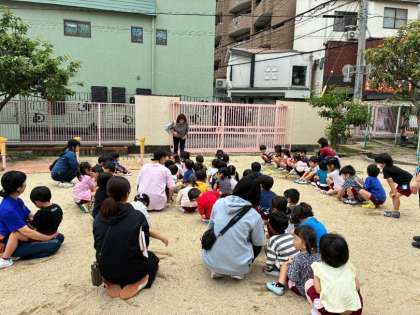 4月に5歳児が避難訓練をする様子を見せてもらったこともあり、みんな落ち着いて、真剣に参加することができていました。非常ベルの音や、いつもと違う真剣な先生たちの姿に、少し不安そうな子どももいましたが、「とっても上手にできていました。はなまる!」と園長先生に褒めてもらって、嬉しそうにしていました。