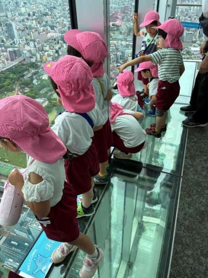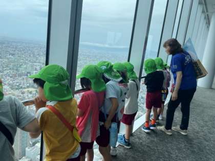 曇り空の中、きれいに景色が見られるのか少し心配していましたが、思ったより雲がなく、遠くの景色まで楽しむことができました。60階まで一気にあがるエレベーターに大喜びの子どもたち。60階では、自分たちが住む阿倍野の街を見下ろし、「あ!てんしばや」「あっちに海が見えるよ」「みゃくみゃくの電車走ってる〜」と、それぞれが発見したものを嬉しそうに伝え合っていました。昨日準備した、園庭のにこちゃんマークや年長さんサプライズのパラバルーンもばっちり見えていました。隣で景色を見ていた方が、「あの赤い橋の向こうが万博だよ」と、子どもたちに教えてくれて、赤い橋を一生懸命探す姿も見られました。ひよこ組さんにとっては初めての遠足でしたが、年長さんがしっかりと手をつないで連れていってくれて。大きなケガもなく、楽しく園外保育を終えることができました。保護者のみなさんも送り迎えありがとうございました。