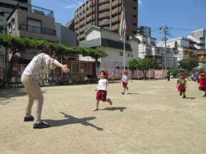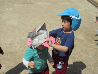 そして、クラスごとに園長先生のところまで思いっきり走りました。3・4歳児は、ゴールで待つ5歳児からカブトをかぶせてもらって大喜びでした。