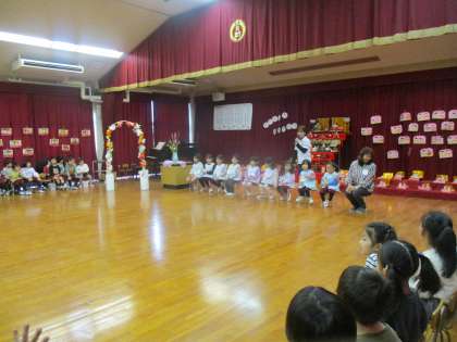 立派なおひなさまとみんなのつくったかわいいおひなさまに囲まれて、華やかなお誕生会になりました。これで今年のお友達全員の誕生日のお祝いができましたね。最後はみんなで『たんじょうづきなかま』を楽しく踊りました。お祝いしてもらう子どもたちも、おめでとうと言う子どもたちも、みんなが嬉しい気持ちになるお誕生会です。