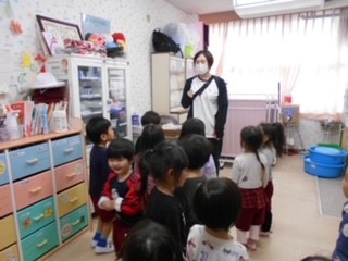5歳児もり組が3歳児ひよこ組の手をひいて、「ここは職員室だよ」「ここは怪我をしたときに来る保健室だよ」と優しく教える姿が見られました。さすが大きい組のお姉さん、お兄さん!とってもかっこよかったです。